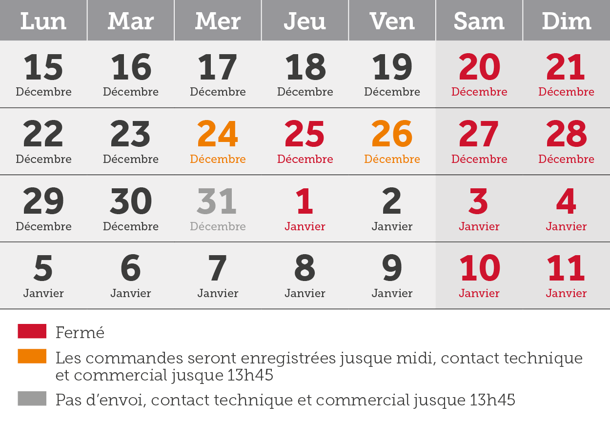 Nous sommes ouverts tous les jours de la semaine à l'exception des : 24 et 31 décembre. Pour le 30 décembre, les commandes pourront être passées jusqu'à 13 h 00. Très bonnes vacances de la part de toute l'Equipe REPA !